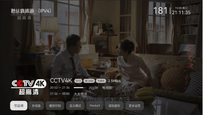 1.如果大家在使用小飞电视时遇到了4K和8K频道没有声音,是因为采用的是av3a三维菁彩声我们需要双击屏幕或者按菜单键调出菜单。