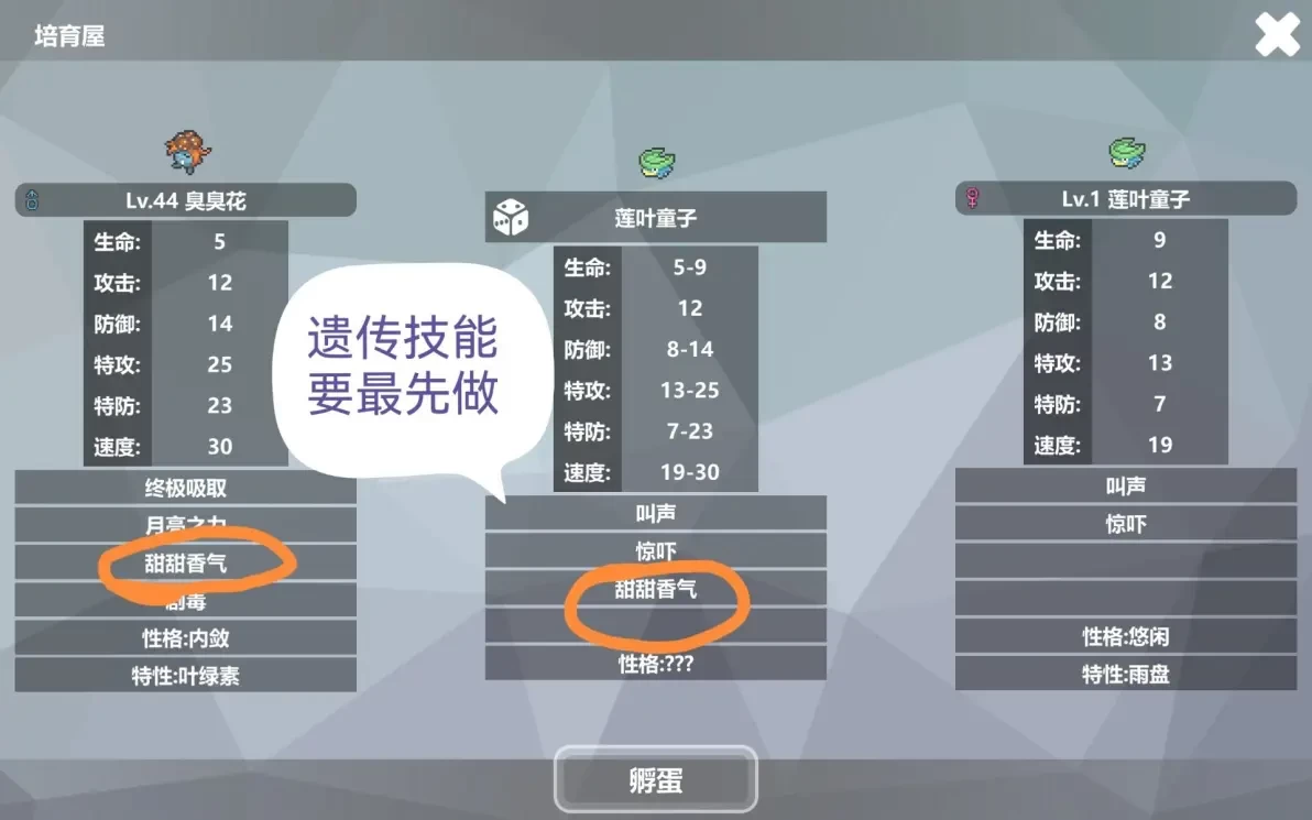 ④遗传技能。很多宠物都能通过孵蛋来遗传技能给子代。我这里以给莲叶童子遗传甜甜香气为例。亲代之中选一个学了甜甜香气的,孵蛋子代将会遗传得到甜甜香气技能。