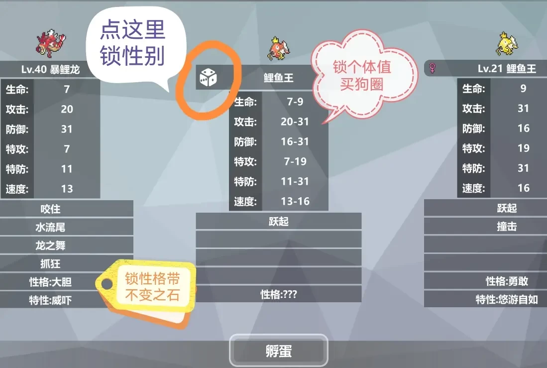 锁个体示例,左边鲤鱼携带生命锁,右边百变怪携带特防锁,子代预计生命v和特防v,其他项则是亲本范围内随机。