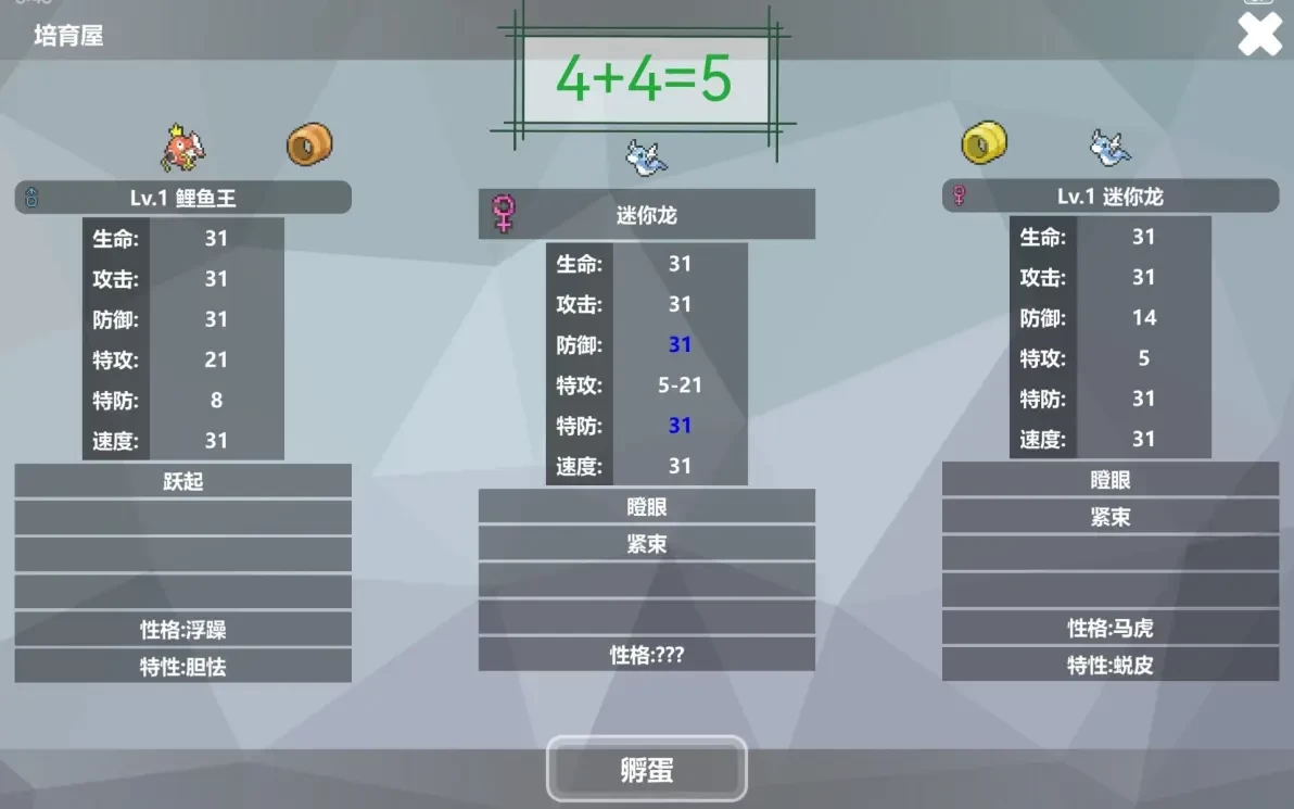 性格手的制作,只需要将性格作为一个单独的v,带入上面的公式,1+1=1,一直合成得到4v对性,再用4v对性+5v孵蛋,即可获得5v对性。