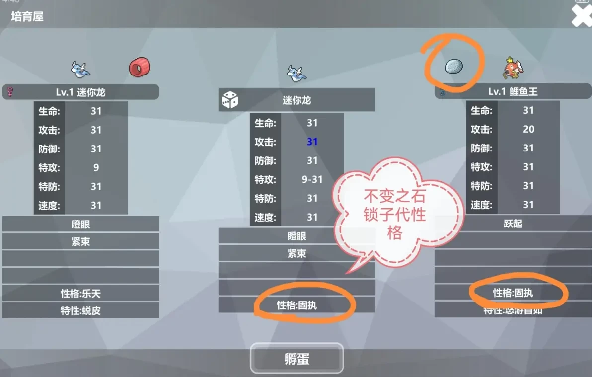 右边的鲤鱼王爆性格固执了(固执加攻击减特防,是常见5v快龙性格选择)(爆性格就是指未做性格的情况下孵蛋得到想要的性格)