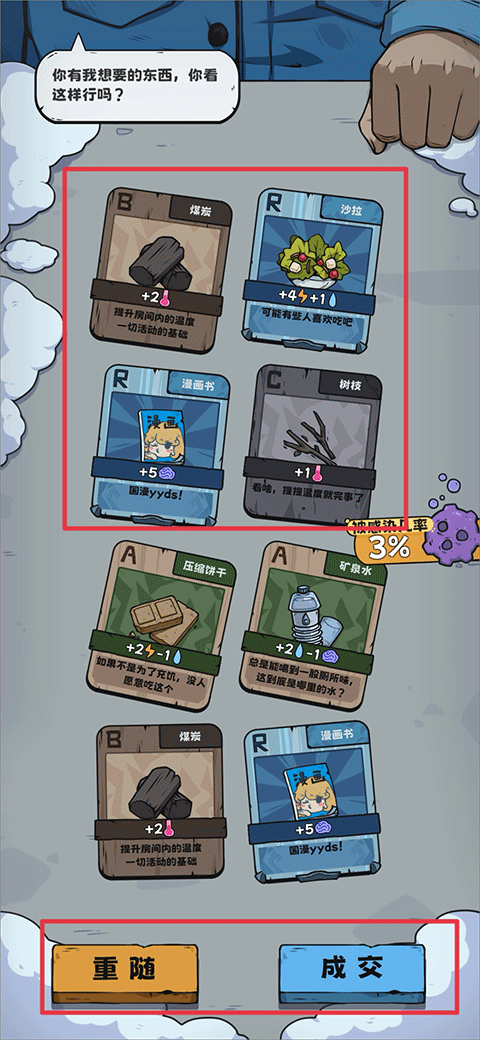 7、然后对方就会根据你的卡牌来给出他的卡牌,若对对方给出的卡牌满意时可以点击成交,不满意则可以点击重随