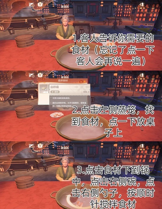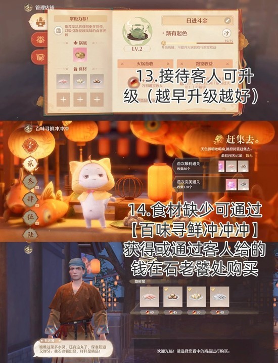 14.食材缺少可通过【百味寻鲜冲沖冲】获得或通过客人给的钱在石老饕处购买